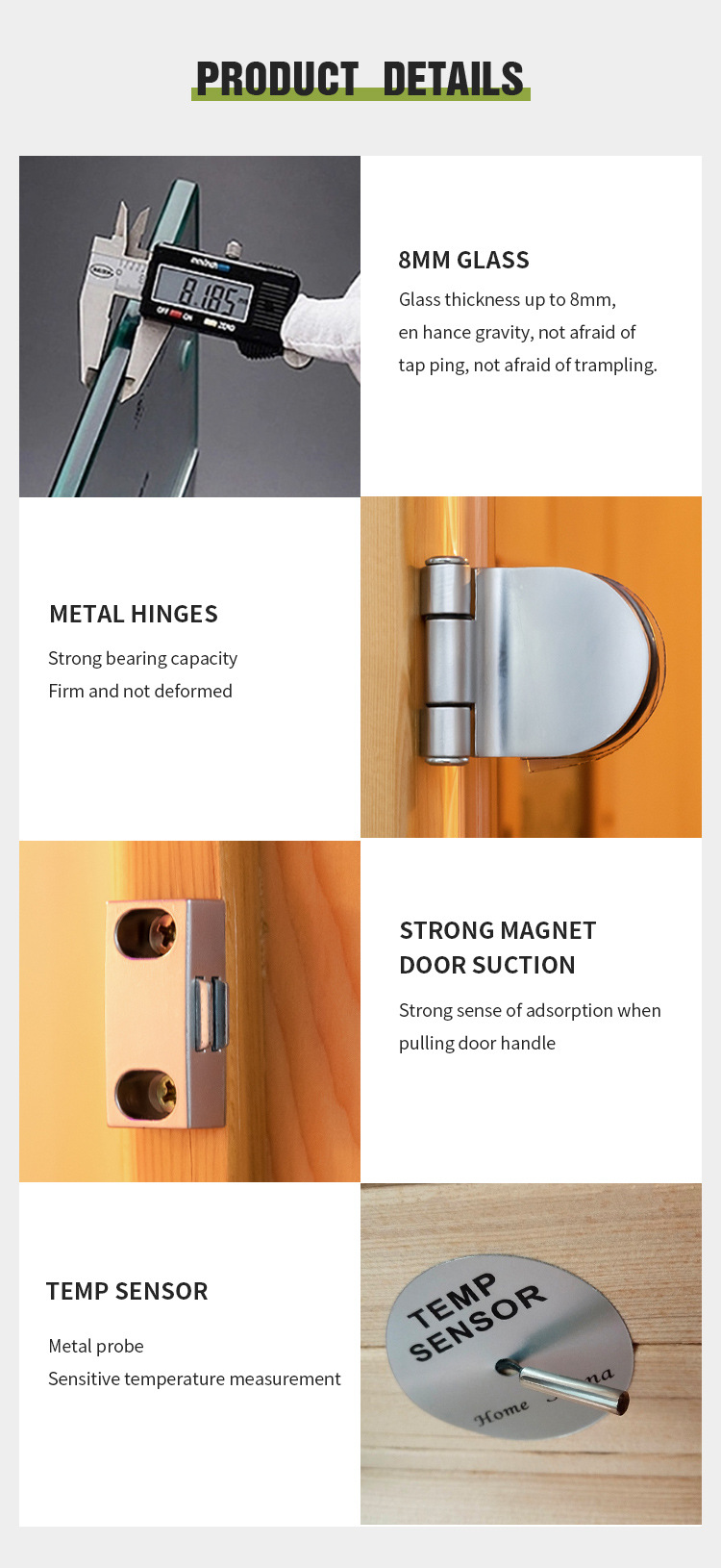 8mm калено стакло: Како што е прикажано во деталите за производот, собата со инфрацрвена и парна сауна од дрво за 1-3 лица има калено стакло со дебелина од 8 мм. Може да се пофали со исклучителна издржливост, со што ја зголемува отпорноста на гравитацијата. Не треба да се грижите за тапкање или газење - тој е направен да издржи секојдневна употреба.