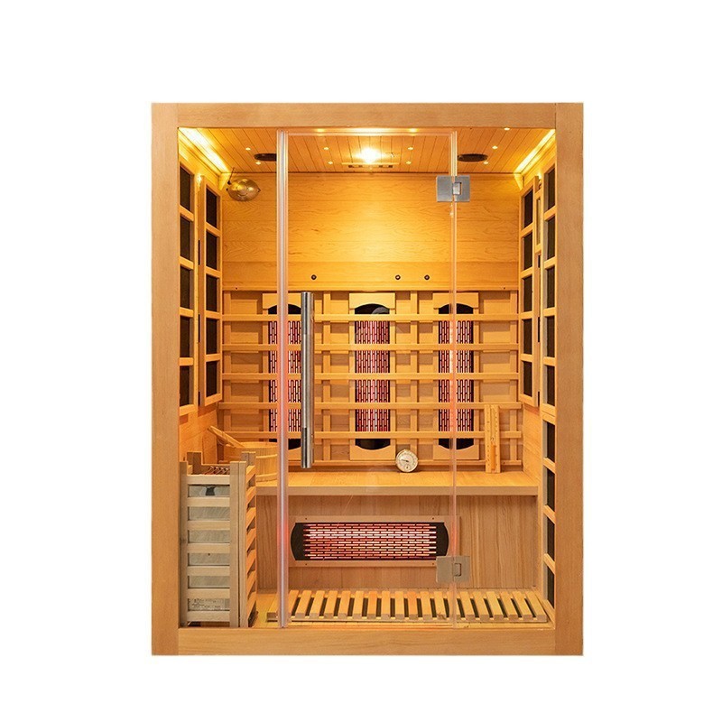Собата со инфрацрвена и парна сауна од дрво за 1-3 лица е преполна со напредни функции за подобрување на вашето велнес патување: инфрацрвени грејачи и далечни - инфрацрвени грејни плочи од графин (обезбедуваат рамномерно, ефикасно загревање за длабока, релаксирачка пот); Јонизатор на кислород (го прочистува воздухот во сауната, создавајќи свежа и заживувачка атмосфера); Reading Light & Speaker (ви овозможува да читате или слушате музика додека уживате во вашата сауна); Контролен панел (овозможува лесно прилагодување на температурата, времето и другите поставки за персонализирано искуство); Шпорет за сауна и цевка со светлосен бран (работат заедно за да генерирате пареа и инфрацрвена топлина, што им служи и на љубителите на пареа и на далечната инфрацрвена сауна).
