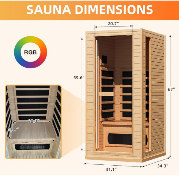 Неговото компактно тело (обично мери околу 100 × 80 × 190 см) е погодно за мали простори како што се домови и станови и е лесен за инсталирање и вклучување за употреба. Внатрешно опремени со удобни клупи и дизајн на мрежи за дишење, заедно со интелигентен систем за контрола на температурата (прилагодлив температурен опсег од 30-65 ℃), времетраењето може да се постави според потребите (0-60 минути), балансирање на безбедноста и удобноста.