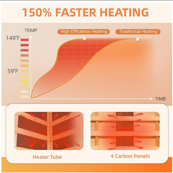 【Ефикасна технологија за греење】 Опремена со 4 јаглеродни панели и 1 јаглеродна цевка, нашата инфрацрвена сауна од 1 лице обезбедува опкружување со опкружување од 360 степени, обезбедувајќи дури и дистрибуција на топлина. Обично, се загрева за само 10-15 минути, овозможувајќи ви да уживате во вашето искуство со сауна без одложување.