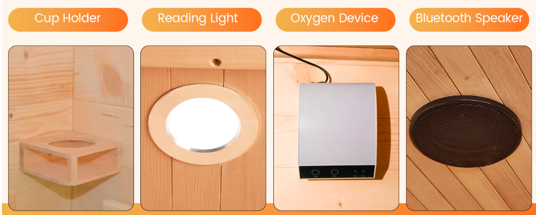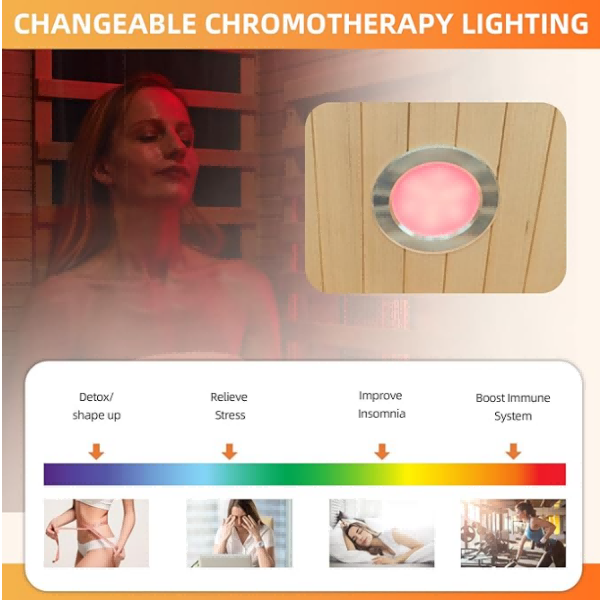 【Подобрена релаксација】 Нашите инфрацрвени сауни за дома се одликуваат со покрив осветлен со 7 терапија со светлина во боја, создавајќи потоплива атмосфера за подобрување на вашето целокупно искуство. Лесно е инсталиран во вашиот подрум, бања или теретана, и со Bluetooth конекција и шипка за кислород, можете да уживате во релаксирачка сесија на сауна